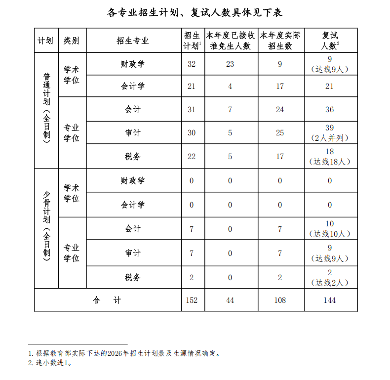 财科院硕士研究生招生实行差额复试。进入复试的考生人数与本年度实际招生数的比例为:学术学位硕士120%,专业学位硕士150%,少数民族高层次骨干人才计划(以下简称“少骨计划”)考生参加复试的比例与本专业普通计划考生相同。复试分数线详见财科院研究生院网站《财政部中国财政科学研究院关于公布2026年硕士研究生招生考试复试分数线的通知》。考生初试成绩(单科及总分)须达到所报考专业复试分数线要求,并且符合我院招生章程公布的报考条件,复试考生名单见附件1。