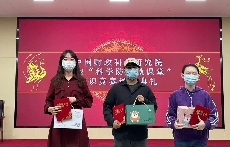 2022年5月13日,中国财政科学研究院“科学防疫微课堂”线上答题比赛颁奖典礼在218教室顺利举行。此次答题比赛面向财科院全体师生,旨在通过对防疫知识问答的比拼来增强全体师生的防护意识以及防护能力。