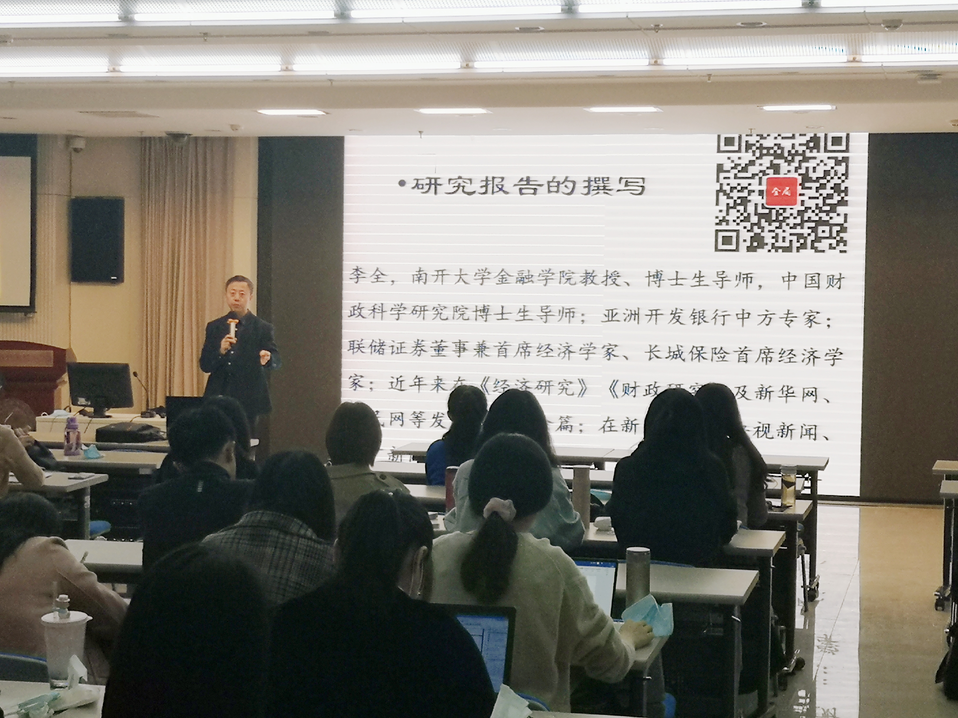 2020年10月26日晚,南开大学金融学教授、中国财政科学研究院博士生导师李全在新知大厦218学术报告厅为我院审计、会计、税务专业硕士研究生讲授《案例集训营》第一讲。同学们积极踊跃、求知若渴,部分学术型硕士研究生和博士研究生也到场聆听了李老师的培训课程。