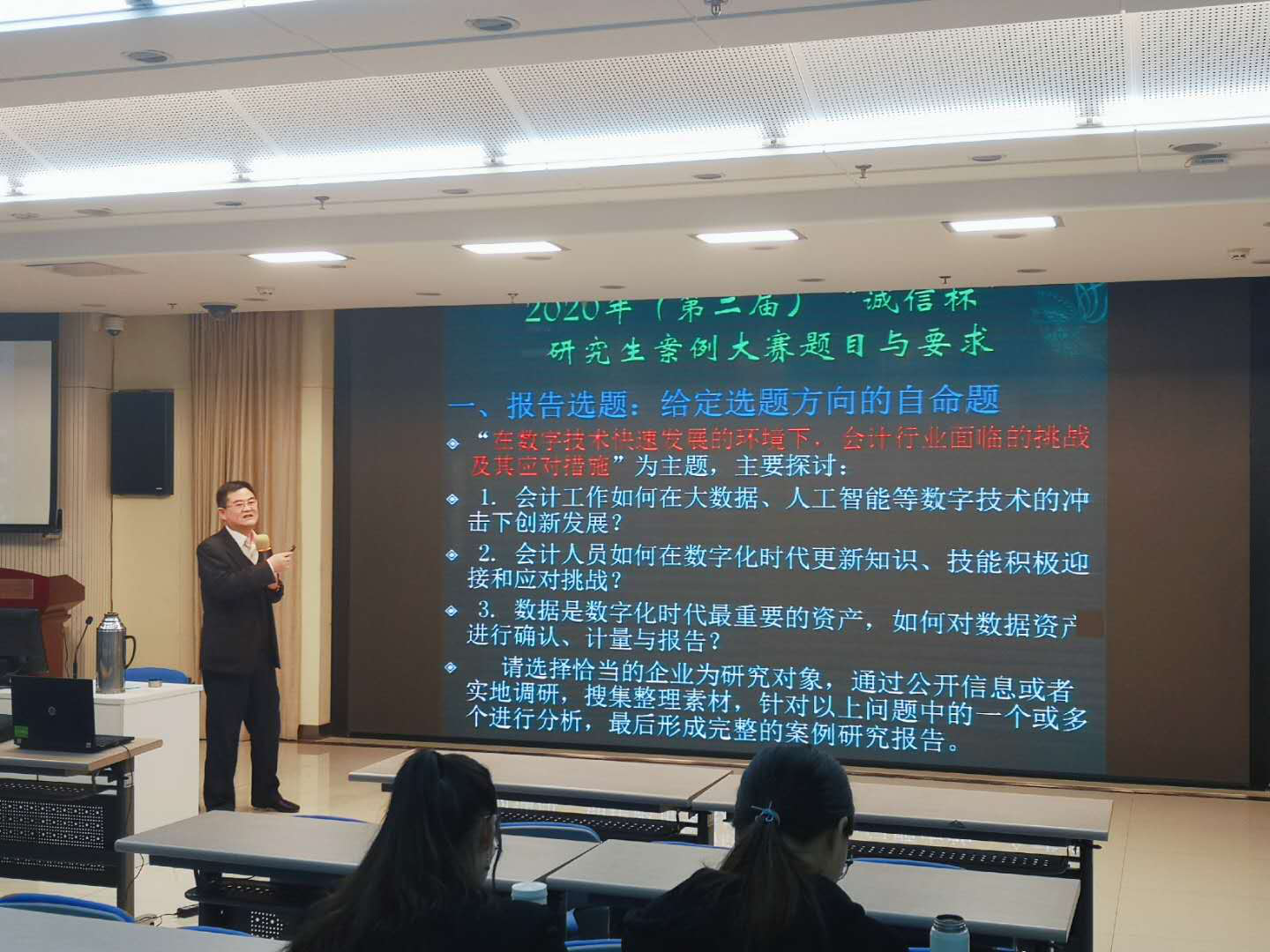 随后,李老师就案例报告的选题为我们进行更深一步的讲解。此次案例大赛采用的是给定选题方向的自命题,即“在数字技术快速发展的环境下,会计行业面临的挑战及其应对措施”,主要探讨: