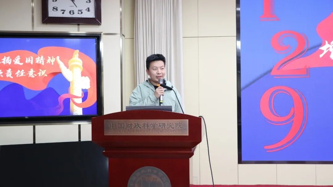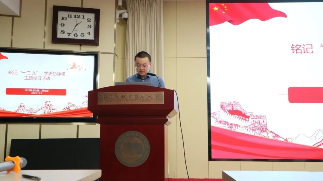 2023年12月9日下午,为深刻领会和全面把握党的二十大精神实质和丰富内涵,坚持不懈用习近平新时代中国特色社会主义思想凝心铸魂,研究生院按照《财科院贯彻落实全国宣传思想文化工作会议精神实施方案》相关要求,以纪念“一二·九”运动八十八周年为契机,在218学术报告厅开展“铭记‘一二·九’,学史忆峥嵘”主题党日。将学生党建活动与校园文化活动相融合,在真学真懂真信真用、深化内化转化上下功夫,激励广大财科学子从历史经验和革命精神中吸取养分,坚定强国报国之志。学生工作处负责人郭辉、学生党建联络员王玉勇、梁栋与160余名学生党员及入党积极分子共同参与学习交流,活动由2022级学生第二党支部副书记程东主持。